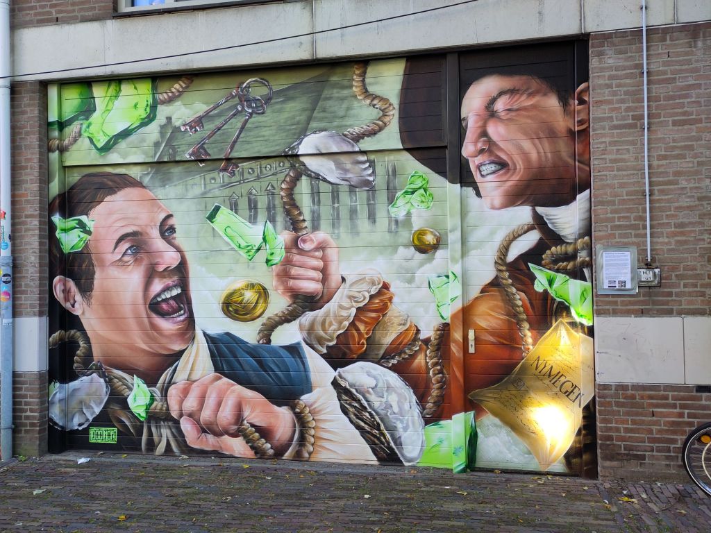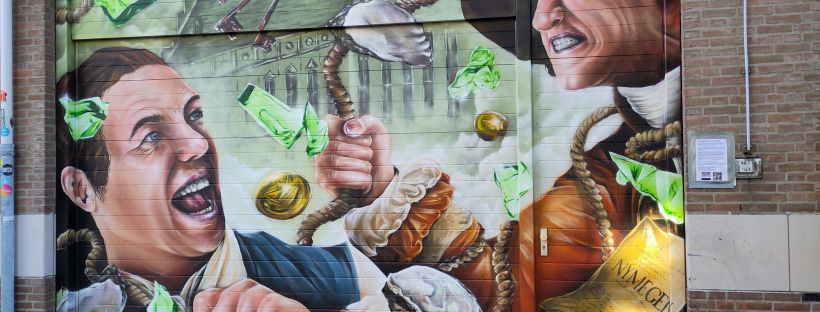 De nieuwste muurschildering van het initiatief Waalpaintings gaat over de Nijmeegse Plooierijen! Het is te vinden aan de Ganzenheuvel in het centrum, op een garagedeur. Mijn roman ‘Oproer tussen Maas en Waal’ gaat over het eerste jaar van deze roerige tijden, 1702-1703. Ik heb in de voorbereidingen mogen helpen, door de kunstenaar en een groepje studenten uitleg te geven over wat er allemaal gebeurde in die tijd. Daar hebben ze de inspiratie uit gehaald voor de schildering. Een erg leuk initiatief, die deze boeiende periode uit de Nijmeegse geschiedenis een plekje geeft in de stad.